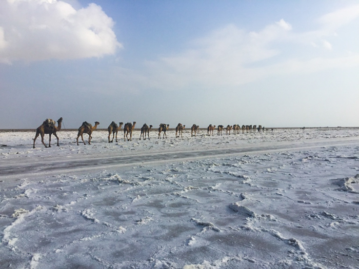 The Danakil Depression marks the northern end of the Great Rift Valley on the African mainland, the point where Earth’s forces are most actively tearing the continent apart. It is an extremely arid, hot desert area which stretches from the coastline of Eritrea through north-eastern Ethiopia and western parts of Djibouti. The Danakil is an area of outstanding geological interest, providing a unique window on the underlying processes which have created the Earth’s continents and land masses. Here, in relatively close proximity, geological features associated with the splitting of continental land masses are clearly seen, including intense volcanic activity (with one of the few permanent lava lakes on the planet on Mount Erta Ale), hot sulphur springs elaborately decorated with extraordinary coral-like formations as well as salt-encrusted lake beds. An expedition to the Danakil Depression will always be a unique adventure!!