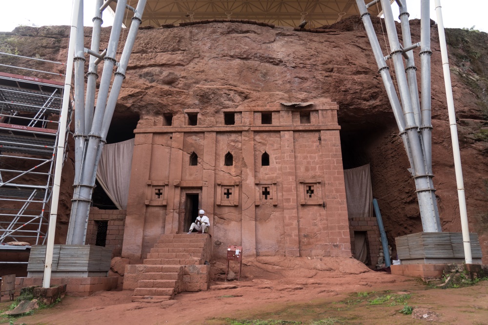 Located at the end of a winding dirt road 42 kilometers from Lalibela, the church of Yemrehana Kristos sits in a shallow cave where it was constructed during the 11th or 12th centuries. Built of wood, stone, and marble, the architecture is quite different from the churches of Lalibela and the cave and adjacent forest create a very tranquil setting. Near the church, on the edges of the cave’s interior, lay the skeletal remains of hundreds of Orthodox Christians where they have rested for centuries